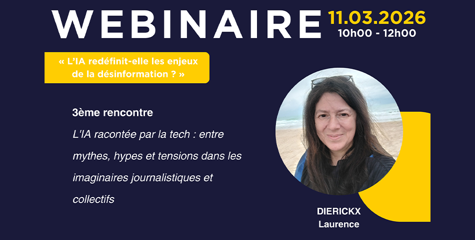 Nous aurons le plaisir d’accueillir Laurence Dierickx, docteure en sciences de l’information et de la communication (ULB) et chercheuse postdoctorale à l’Université de Bergen (UiB, Norvège). Son intervention portera sur la manière dont l’intelligence artificielle est racontée par l’industrie technologique et relayée dans les sphères médiatiques et journalistiques : Entre hype, mythes fondateurs et récits technologiques dominants, comment ces narratifs influencent-ils les pratiques journalistiques, les imaginaires collectifs et les représentations citoyennes de l’IA ? Quels effets produisent-ils sur notre compréhension de la désinformation et sur la capacité à développer un regard critique ?